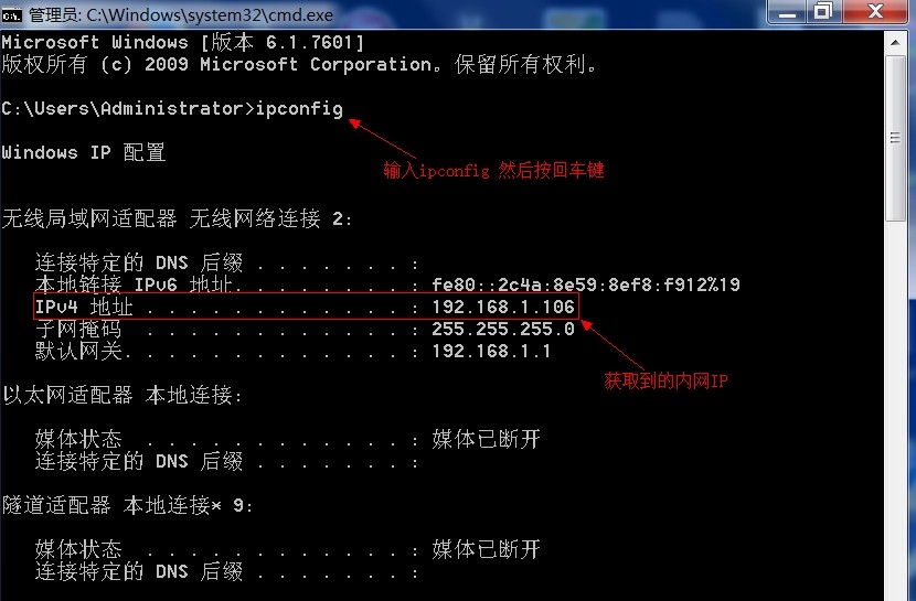 第二步:在黑色背景DOS窗口輸入ipconfig然后回車,獲取主機的IP地址