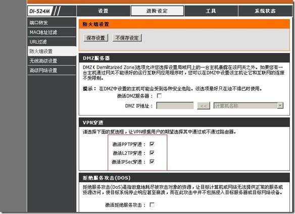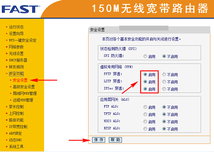 進入界面后---安全設(shè)置---里面SPI防火墻選擇不啟用;設(shè)置PPTP、L2TP都選擇啟用