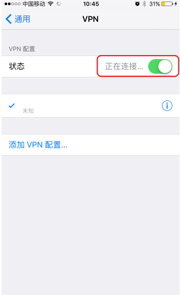 第七步: 存儲(chǔ)后會(huì)在多出一個(gè)剛添加的賬戶,先選中,再滑動(dòng)小按鈕,顯示正在連接