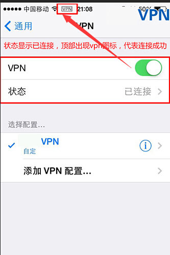 第八步: 連接成功,狀態(tài)顯示已連接,頂部出現(xiàn)圖標(biāo),表示連接成功