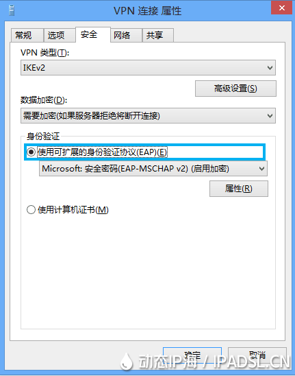 (四)然后在安全選項卡里面選擇IKEv2,身份驗證里選擇“EAP-MSCHAP v2”確定后即可點擊連接了